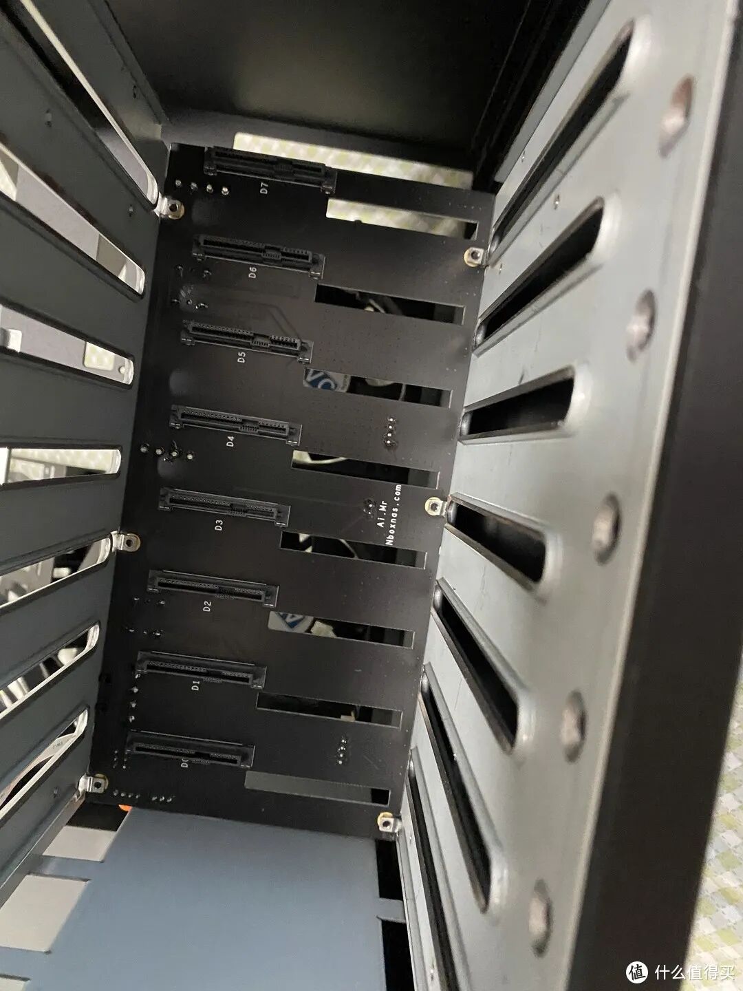 NBOX是最紧凑的8盘位机箱,外壳的螺丝位布局,纯黑设计,外观简约大气,颜值还是不错的。