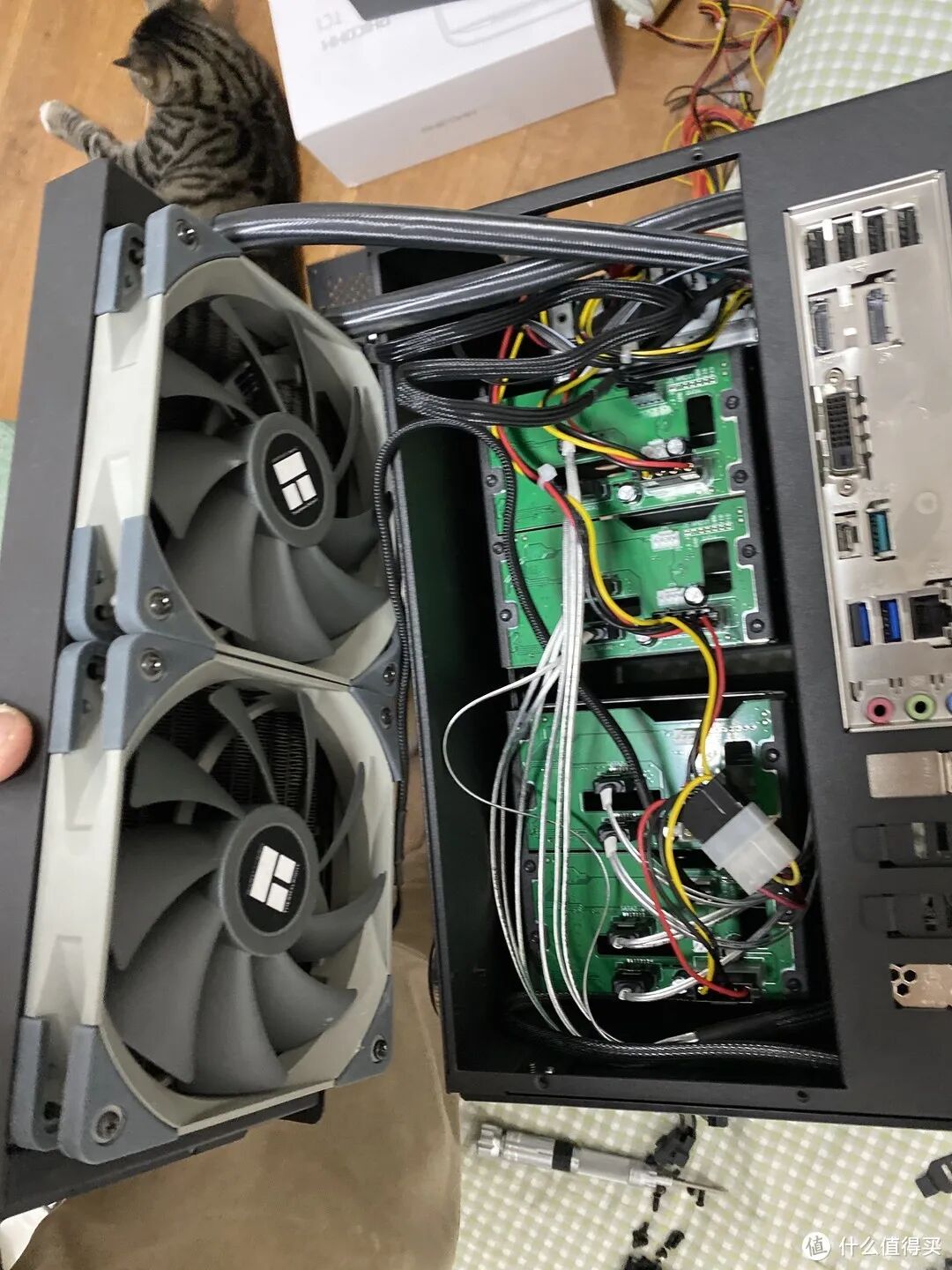 定制线用上了,终于可以理线把240水冷塞进去了。发现还是不够距离,咨询商家后才知道,240只能用薄扇,无法用厚扇。最后逼的我用绝招,上铜柱!