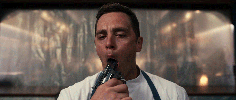 在主厨的一番引荐后,忠心耿耿的副主厨当场表演吞枪自尽,给众人助兴,顿时吓尿众人,更可笑的是众人还连忙自己打圆场,这是追求戏剧体验的逼真表演。