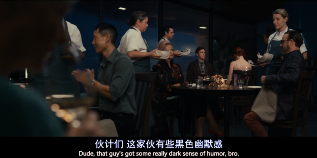 片中,此角人设有着一个标志性的拍手动作,其一个拍手,手下二十多人的后厨助手全部列队,要说军事化管理方式也没什么,但行业对象不合适,餐厅品菜本来是件放松的事,可惜除了女主,其他权贵食客没人觉得不妥,日常对尊卑阶级习以为常,察觉不到支配,自然也察觉不到危险……