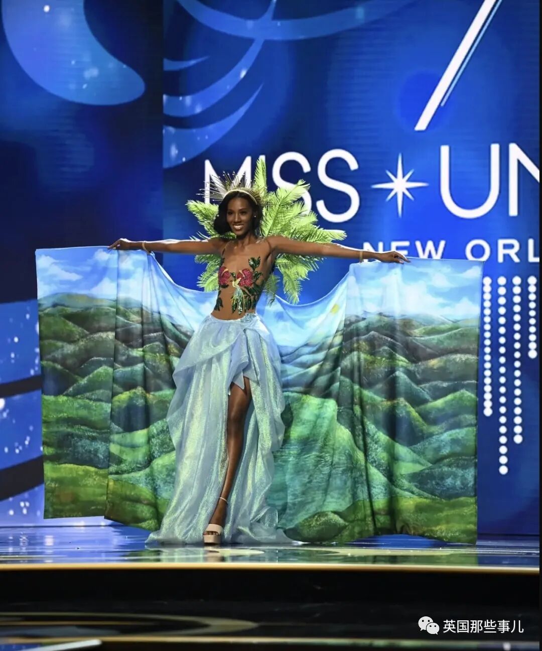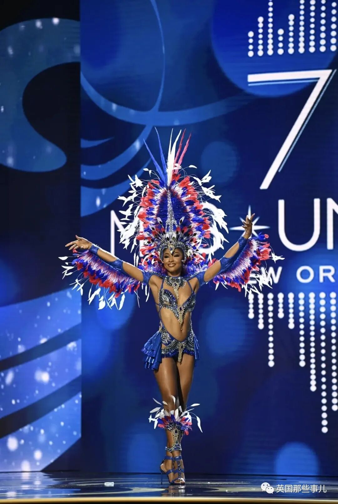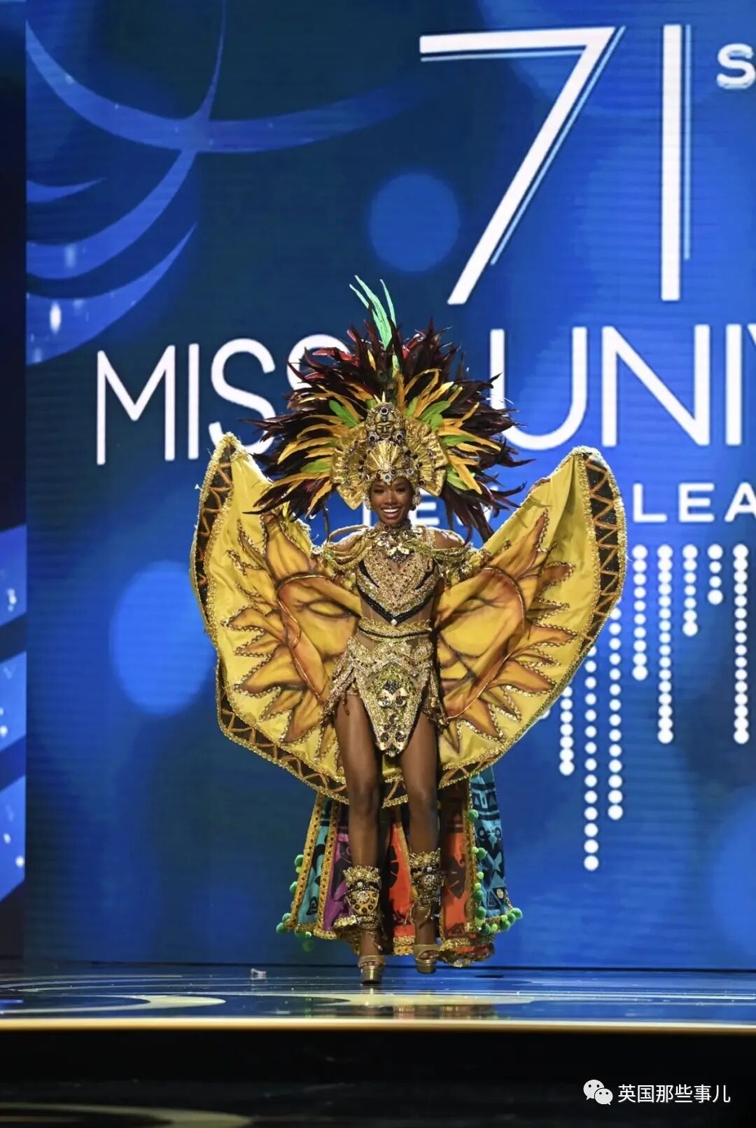 特立尼达和多巴哥小姐Tya Jané Ramey将祖国的狂欢节带到了T台之上,超大头饰引人注目。