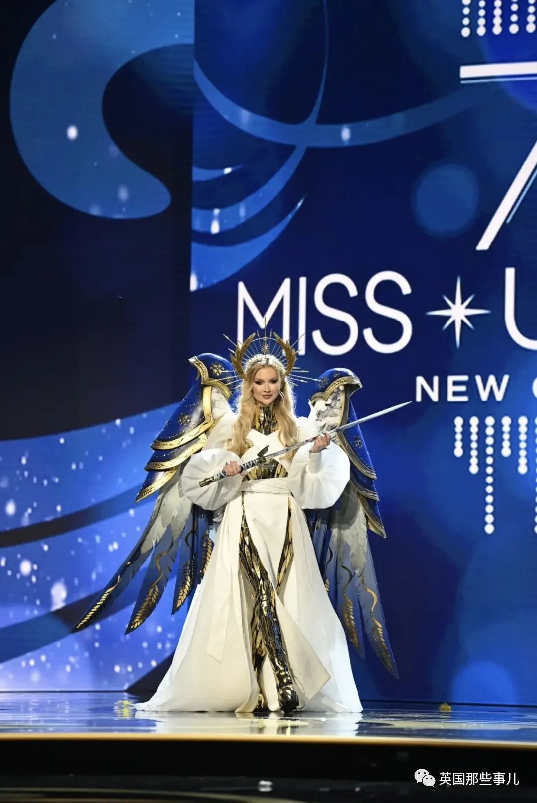 乌克兰小姐Viktoriia Apanasenko的服装来自于征服邪恶的天使长米迦勒。