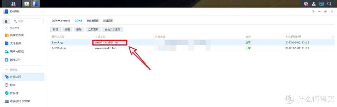🔺回到DDNS界面就能看到我们刚刚添加的解析了,而红框位置的地址就是我们访问群晖的固定地址。