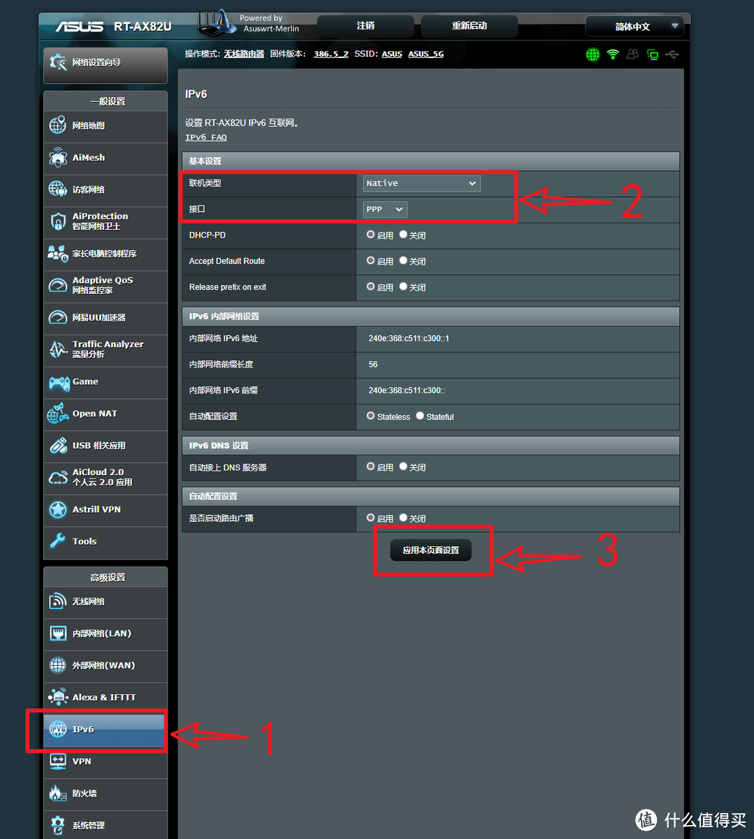 🔺最后我们还要找到路由器中的IPv6设置,联机类型选择【Native】,接口选择【PPP】,其它的保持默认,然后“应用本页面设置“。