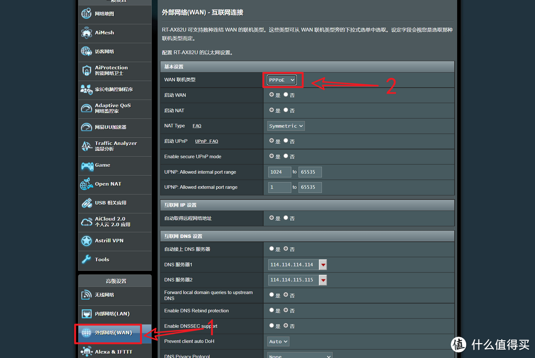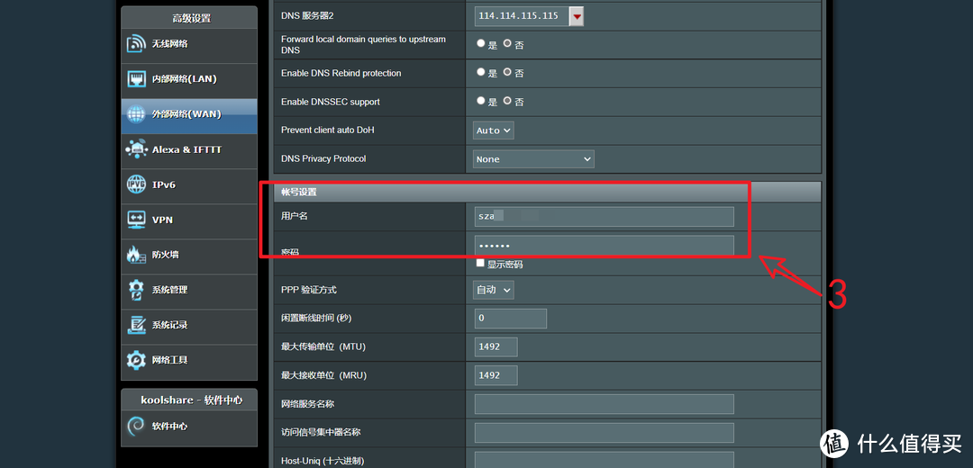 🔺然后再回到路由器设置拨号。上图是华硕路由器的拨号设置,其它品牌基本大同小异,具体请自行百度。