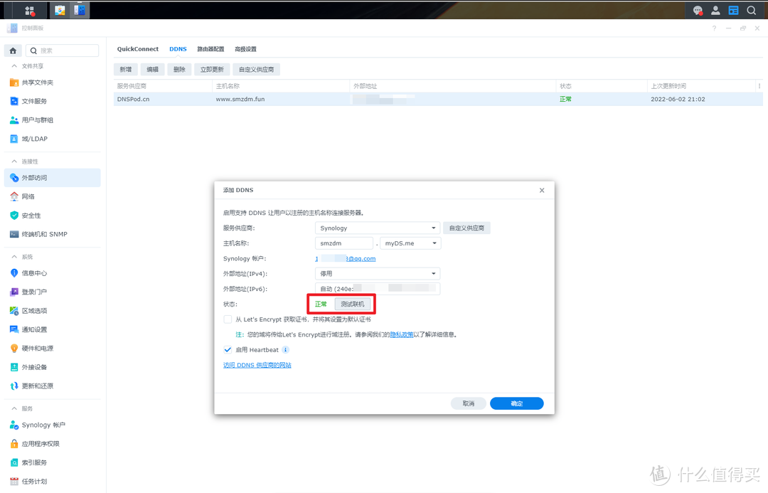 🔺点击“设置面板—外部访问—DDNS—新增”,服务供应商选择群晖自己,主机名字随意写一个,IPv4那里选择停用。可以看到IPv6那里已经自动获取了地址。我们点击一下“测试联机”按钮,如果显示绿色的“正常”,就说明没有问题,然后点击“确定”保存设置。