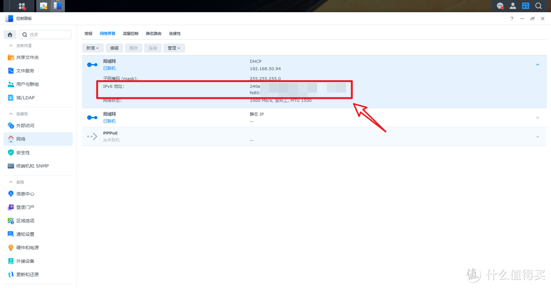 🔺打开群晖后台“控制面板—网络面板—网络界面”。正常来说,只要前面你的路由器成功开启了IPv6,这里会自动识别到IPv6地址的。可以看到在群晖里面IPv6地址后面有两个,最上面的就是群晖分配的IPv6地址,而下面的一个其实是本地链路地址,我们可以不用管。