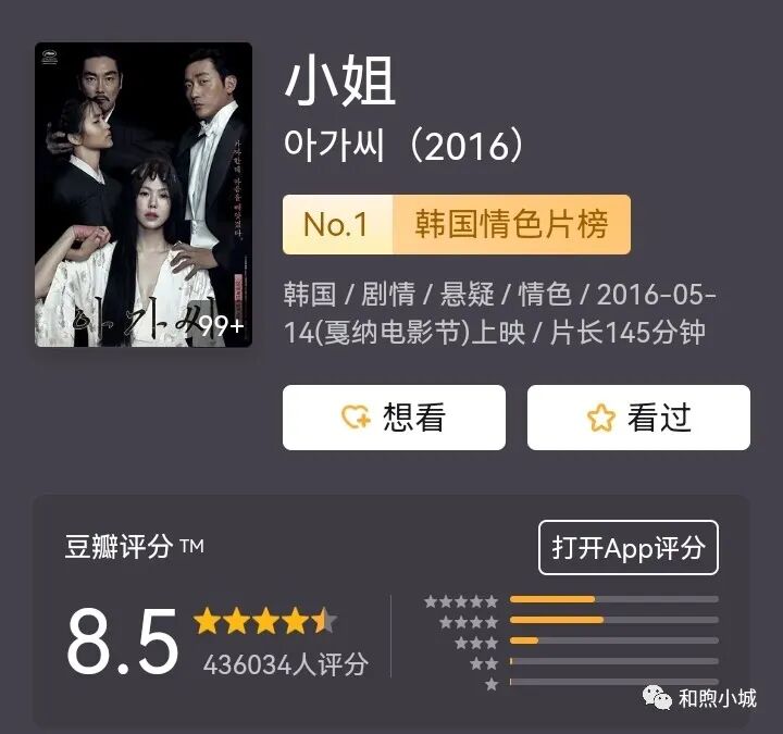 2016年《小姐》豆瓣评分:8.5。主演河正宇、金泰梨、金敏喜----