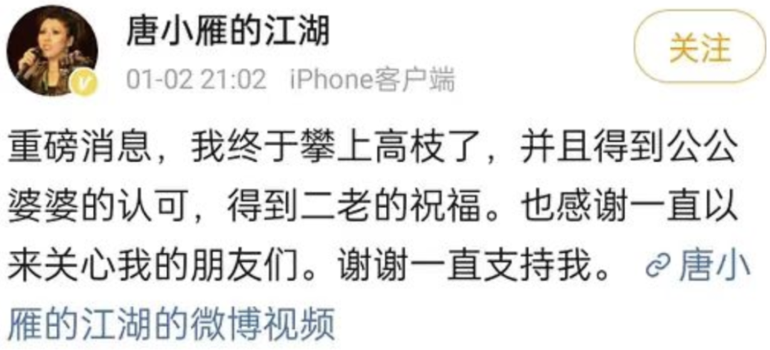 连唐小雁自己在微博官宣时,都开玩笑说自己“终于攀上高枝”了。