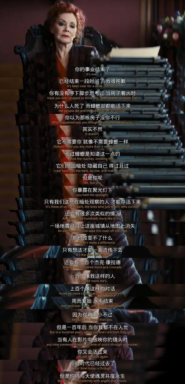 女演员的母亲本就是精神病,她自己也没有自控能力,不仅狂躁奔放,野性难驯,而且好赌成性,死性不改,最终被时代抛弃,创下大祸,从辉煌走向灭亡。就像古代的“巴比伦”王国,曾经的辉煌帝国,浮华的空中花园下,埋藏了多少不知姓名的尸骨?那所有的荒诞不堪、野心勃勃、热情奔放、虚与委蛇、黯然神伤、肮脏猎奇、令人作呕。。。如今只剩一捧黄沙,一缕青烟。首先,没有什么是全新的。一切都在望向过去,每一个瞬间都不是第一次展现在我们面前,然而我们却是第一次有了如此望向历史的目光。无论你承认与否,电影就是一个臭名昭著的婊子,正像斯皮尔伯格讲述的,它首先给予我们梦想,而在现实中所做的第一件事就是背叛它。允许我们窥见乌托邦的模样,又一一将其分解至支离破碎。我们迷恋它,因迷恋而背离,在堕落中成就自己,又不再能承认堕落,因为所有的历史,我的历史,我眼中世界的历史,都已经填充在其中,在此之外无处安放了。我们对电影的爱不能是别的,只能是终将自戕,倒行逆施的爱,因此这个世界名叫“巴比伦”。