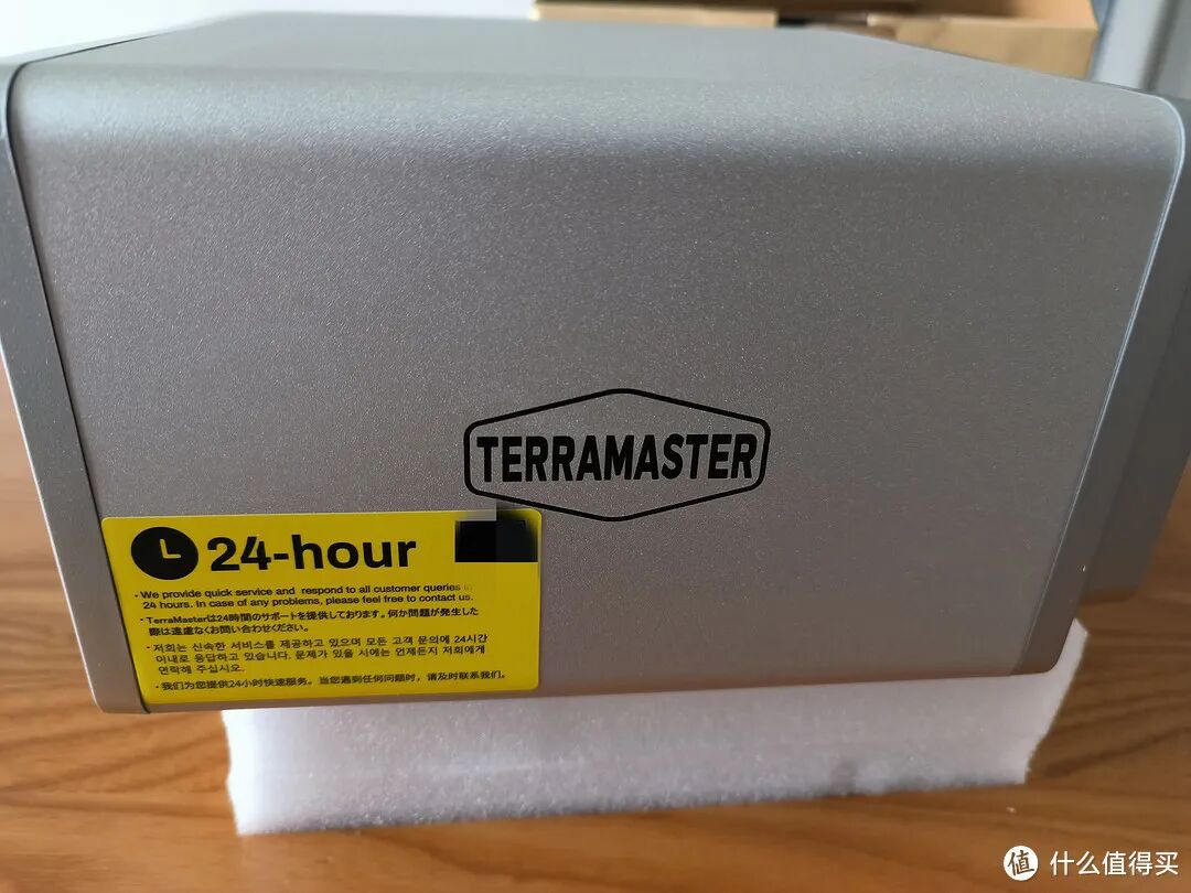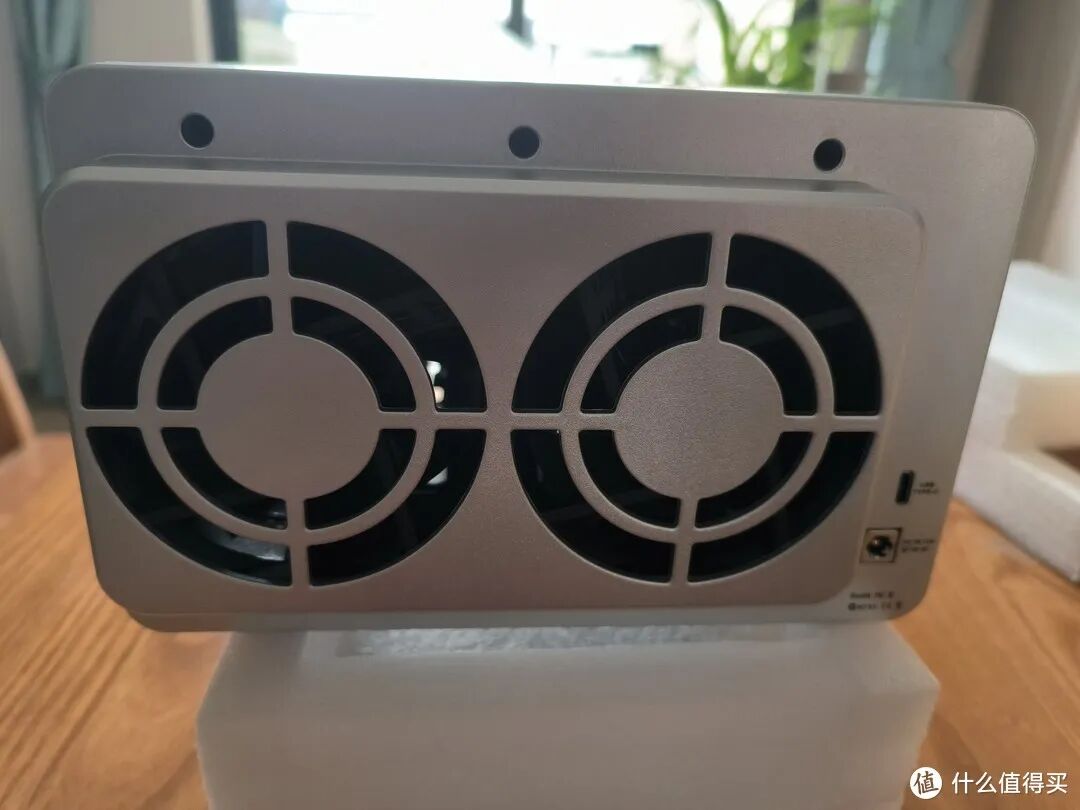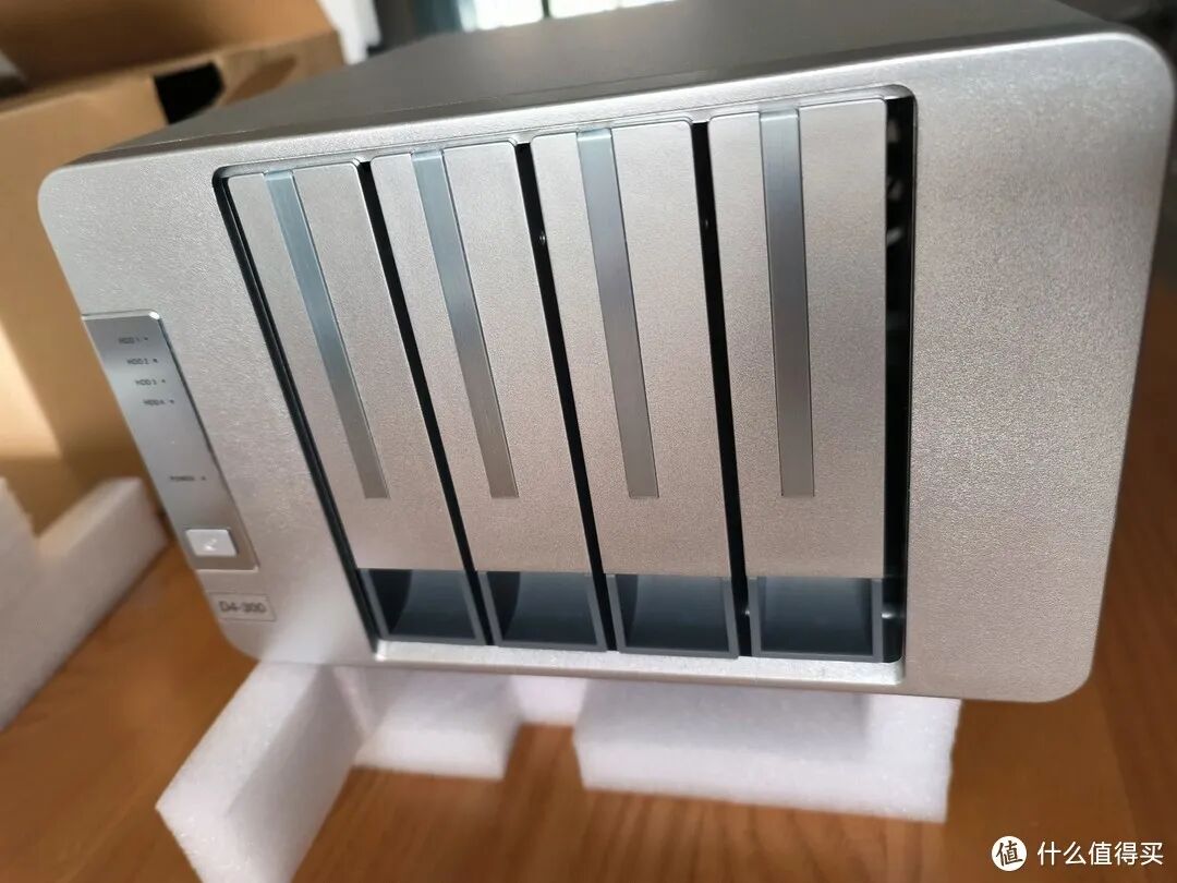 拿出D4-300硬盘盒放在白色缓冲垫上面。看着很不错,实际上塑料感很强,整个机器很轻很轻。
