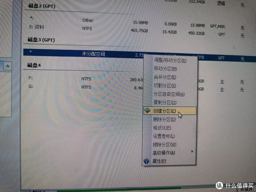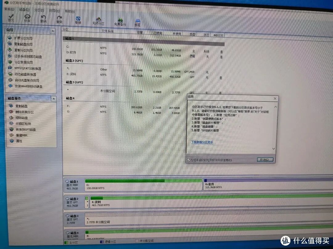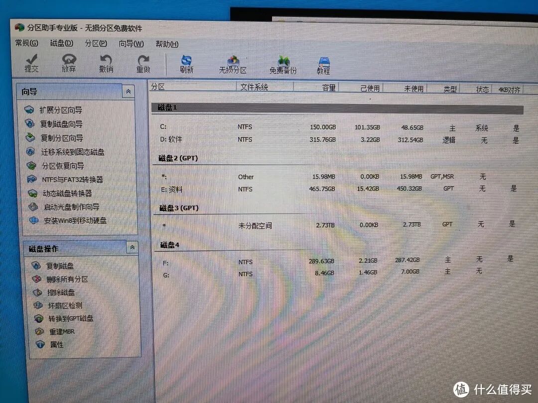 开机后发现Windows系统没有认出来。于是下载了分区助手进行无损分区。打开后就能发现一个未分配空间,容量2.73T,刚好就是那个3T硬盘的容量。