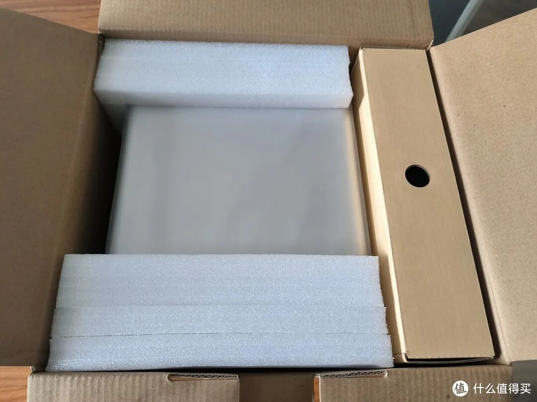 不过里面有个缓冲垫,保护得很好。右侧纸盒子里是电源线及其他配件。