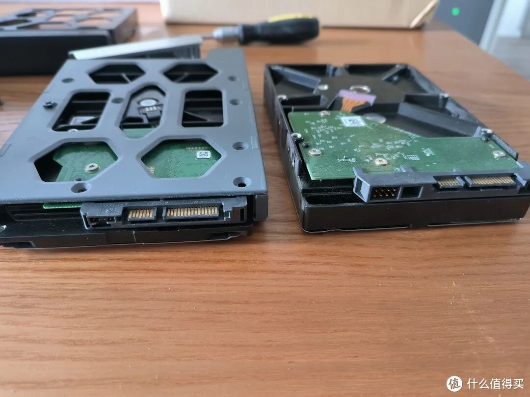 还有一个细节就是安装了硬盘的两个会突出一点,和未安装硬盘的对比,可以很明显看到突出部位。