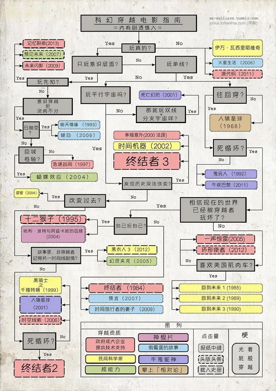 所以影片中也有很多笑点和泪点,当年上映的时候真的非常惊艳。这类循环重启的是别人的时间,与《恐怖游轮》的不同是,你不会遇见之前的你自己。或者我们可以悲观地理解为:每一次重启都是新的平行宇宙,原来的世界还是毁灭了。这两年还有一部比较火的美剧《轮回派对》,也逃不出这样的套路。主题都是用一次次的死亡,修复着BUG,有的是拯救自己,有的是拯救世界。有人统计过,在《轮回派对》第一季中,女主角总共死了44次。与《恐怖游轮》相同的是,这类电影都只在一个小范围时间段内循环。这一小段时间地重复,并不会改变你的出生,你的童年,不会引发祖父悖论。所以,很多时间穿越类电影不能算在其中,穿越≠循环。我在网上找到了一张网友总结的穿越电影指南,大家可以手动保存。再比如海因莱因的《进入盛夏之门》、《你们这些还魂尸》,也就是改编电影《前目的地》的原著。