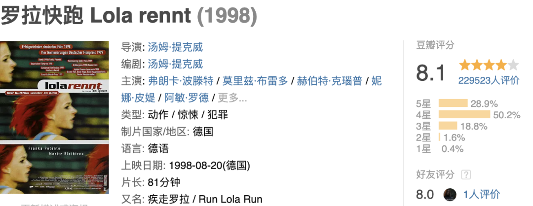 另外,《信条》也是独一份的设定,严格意义上来说不算穿越也不算循环。因为他的设定不是“越”,而是你需要踏踏实实一天天退回去,不能直接越到某一天。1998年,有一部非常成功的德国商业片《罗拉快跑》。讲述了罗拉三次救男朋友的经历,当然与其他的循环故事相比,罗拉仅仅重复了三次好像不足为奇。但《罗拉快跑》最大的特点就是,电影里的时间是和现实里的时间一致的。![]()