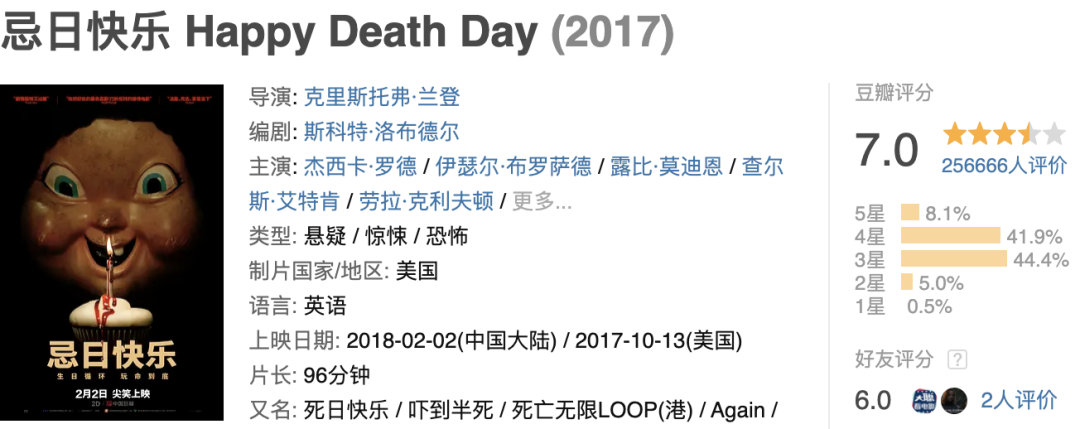 2017年,有一部惊悚喜剧类型的循环电影《忌日快乐》。每次起床后就去寻找凶手,找不到,那就被杀,再起床,重新去找。导演将「死亡循环」的悬疑设定和校园喜剧结合,做了一次相当具有创意的混搭。