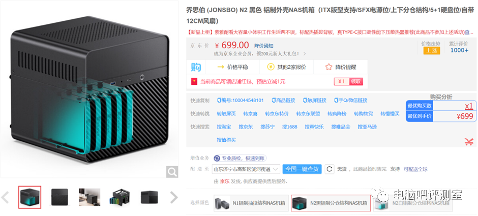最后就是这个机箱了!没选TANK那个6盘位,我自己用的我知道。扩展好是好,但是装起来麻烦,做工也一般!这次装机选个颜值高的,N2算是性价比最高的一个,支持ITX主板,能上5个硬盘,够绝大多数人用了。就是这机箱只能上12cm薄扇,硬盘架一般般,这点不太爽!虽然缺点明显,但是,它好看啊!觉得黑色不行,咱就买白色嘛!还能上一张半高扩展卡,俩2.5G不够咱就来万兆!不过我看了下,京东现在缺货挺严重的,实在不行就淘宝买,一样钱!