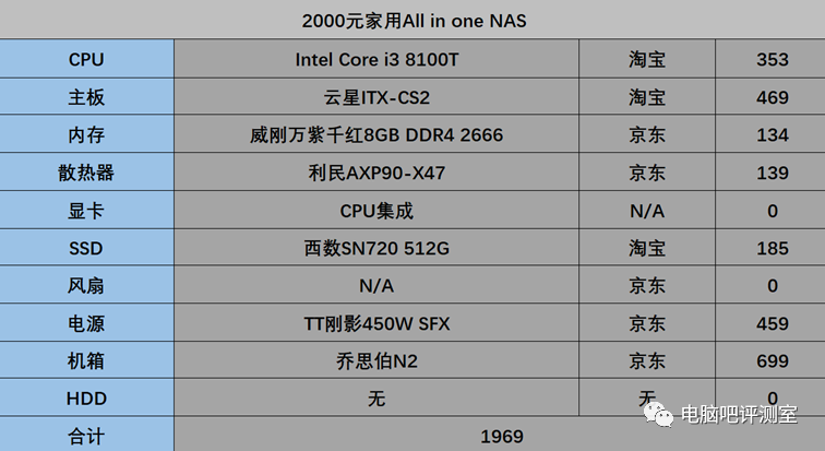 首先呢就是这个NAS的配置了。这次全新的配件依旧采用i3 8100T作为核心,毕竟这是目前性价比最高的NAS处理器(个人认为),性能足够,2000预算分350给它也不算紧张。那么下面就是这台NAS的配置了。