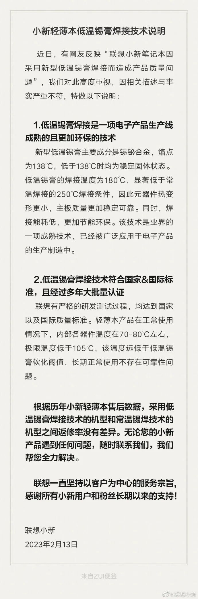 昨日晚间,联想小新官方发布了《有关小新轻薄本使用低温锡膏焊接技术说明》,并称相关描述与事实严重不符: