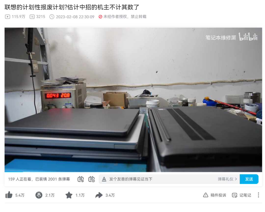 B 站维修 UP 主 @笔记本维修厮 近日发布的一段视频在网上引发热议,称自己收到多台问题一致的小新轻薄本,质疑联想通过低温锡膏焊接技术来“计划性报废”。