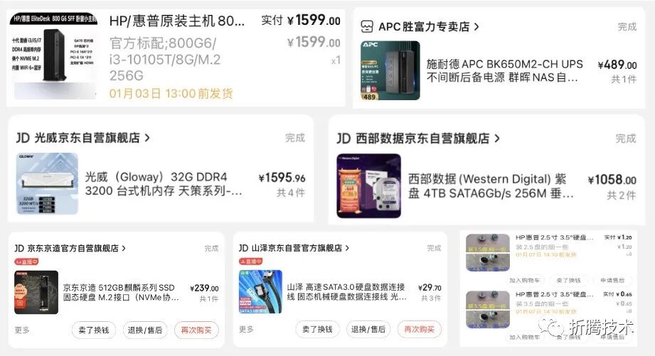 1.一台搭载了 CPU 的“准系统”,用于到手后测试“开箱即用”的测试主板和 CPU。2.一台新款的 APC UPS。3.4 根国产的光威 32G DDR4 内存。4.2 块 4T 的西数紫盘,用于数据存储和数据校验。5.一根国产的京造硬盘,用于存放操作系统,以及避免机械硬盘因为有程序运行无法休眠。6.一些配件:数据线和硬盘螺丝。