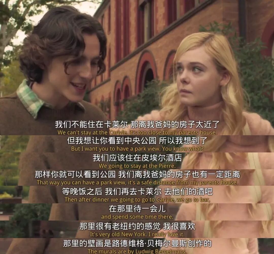 《纽约的一个雨天》里“甜茶”蒂莫西·柴勒梅德饰演的男主,片开就对着女友喋喋不休。“我要在卡莱尔预定一个房间,就是我常和你说起的那个酒店,他们酒吧的钢琴师会唱他以前在百老汇唱的歌。我可能会联系我爸的票贩子,他能帮我们弄到《汉密尔顿》的票。”期间他的女友也就是艾丽·范宁,打断过他一次,说“真不敢相信我要采访《冬日往事》的导演,你快帮我想想有什么有意义的问题”。