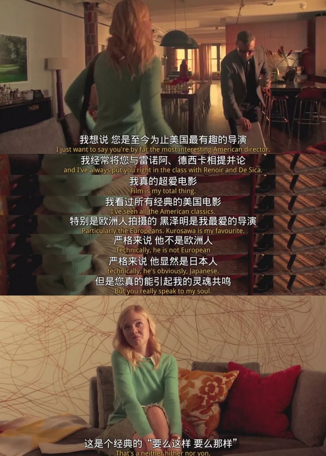 ©️《纽约的一个雨天》,女友是校报的记者,她要去采访一个著名的导演。她既兴奋又紧张,所以让甜茶帮她想出什么好问题来问。甜茶根本不听女朋友说什么,一直在说,活在自己的世界里。见到采访对象后,范宁开始滔滔不绝,说过来说过去也就只有一些“很荣幸采访到你”之类的恭维话,而且情绪异常激动,慌乱中还说黑泽明是她在欧洲电影中最喜欢的导演。
