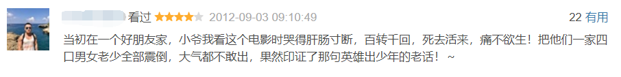 有人看这个电影时哭得肝肠寸断,百转千回,死去活来,痛不欲生,着实吓到了朋友全家人;