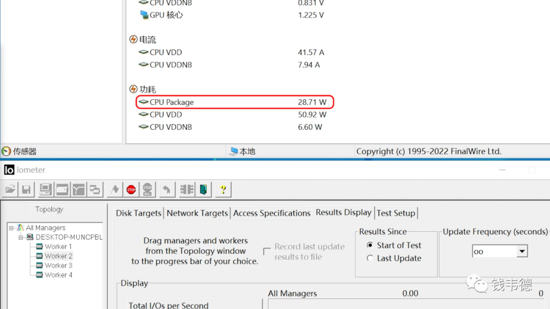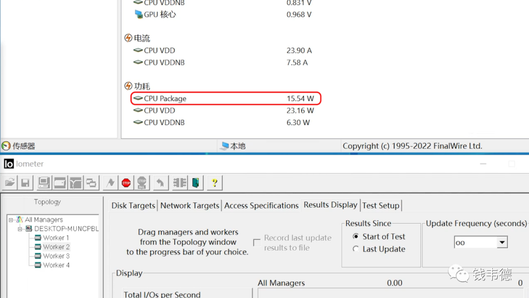 然后加入两块企业级的日立3T盘,使用IOmeter进行4K随机读取的烤盘。机箱底部加装了一把利民的9015风扇,并且向上吹风,和CPU的涡轮扇一起形成向上的风道,风扇转速设置为默认。