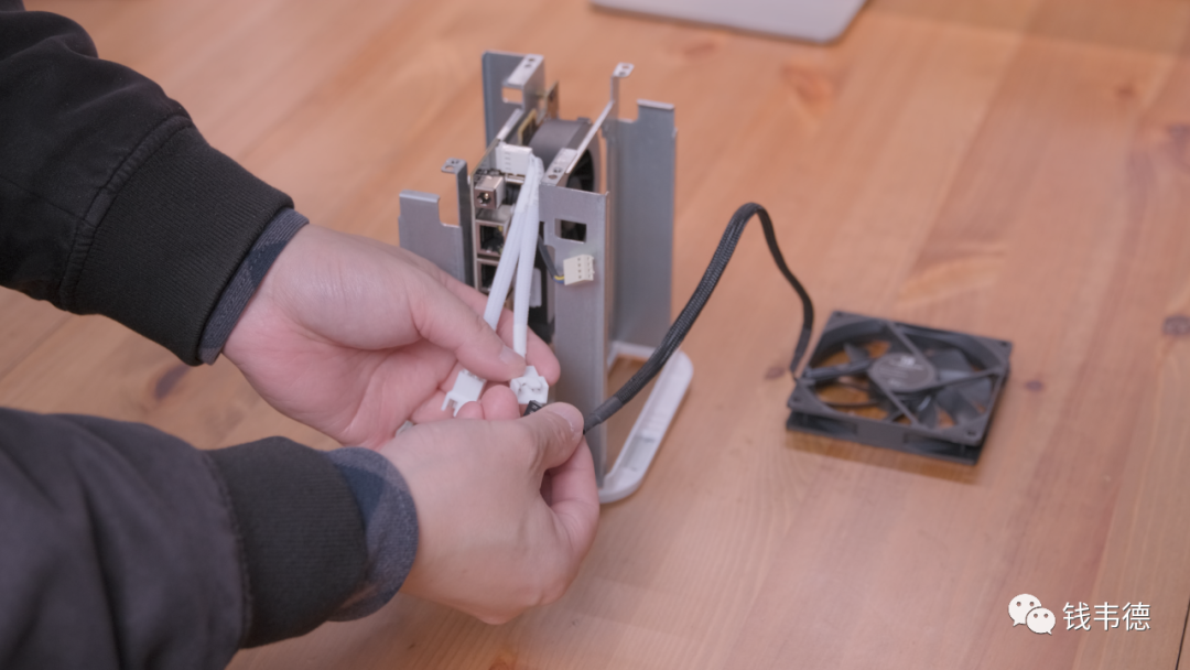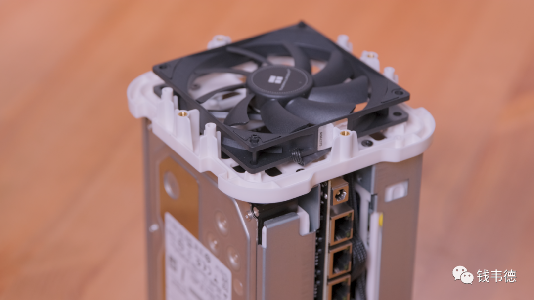 机身没有使用机箱风扇,所以硬盘的散热就比较悬了,等下测试散热试试。底部是留有9cm薄扇的位置,我装了一把利民AXP90上面拆下来的9015风扇装了上去。2023年2月20日更新:卖家已经加装了风扇和增加了一个风扇接口,这个问题已经解决。