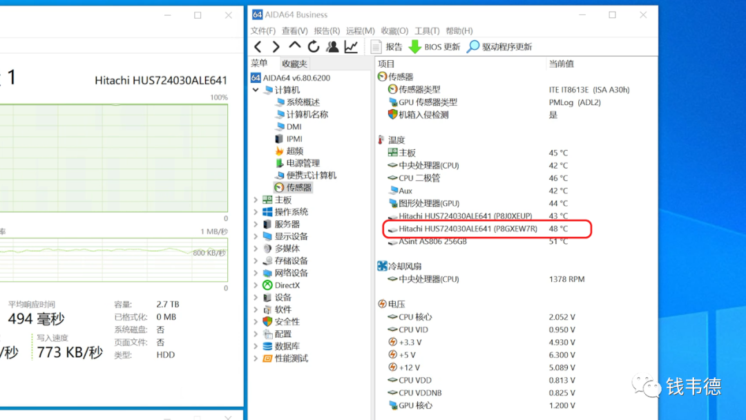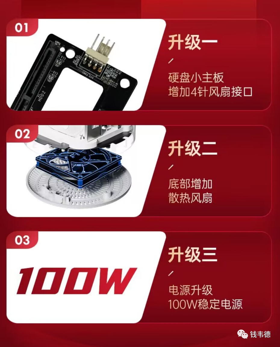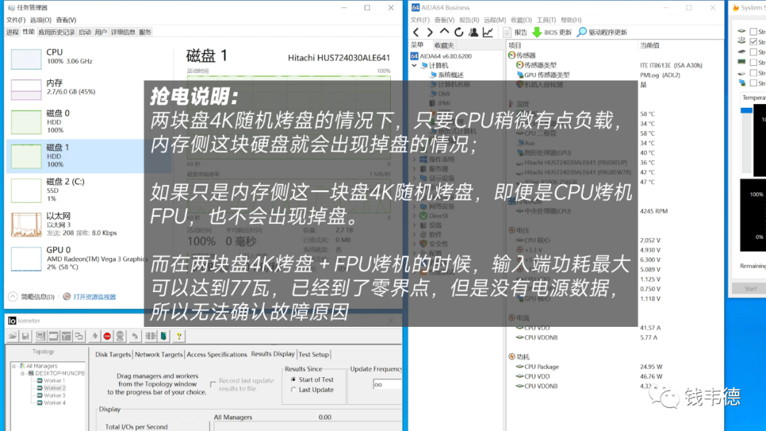 具体表现就是磁头回缩,4K读取的速度归零,这在任务管理器中能直观地展现,并且会发出哒哒的声音。但是这个现象在风扇设置为自动的情况下是没有出现的,所以CPU、风扇会和内存侧的硬盘抢电,这其实也是供电不足,到达了零界点的一种表现。当然在升级了100W的电源之后,这些问题就已经解决了。