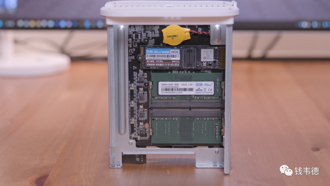 内部是两个的DDR4笔记本内存插槽,和一个PCIe3.0x4的M2 NVMe插槽。