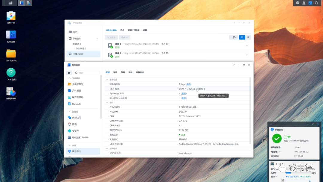 我首先是测试了大家最喜欢的黑群晖,可以物理安装DS918+的7.1的系统,过程我就不细说了,简单地讲,只要找到带有RTL8111网卡驱动的引导,就可以安装成功。当然核显肯定是不能用了,毕竟群晖没有AMD的核显的驱动。