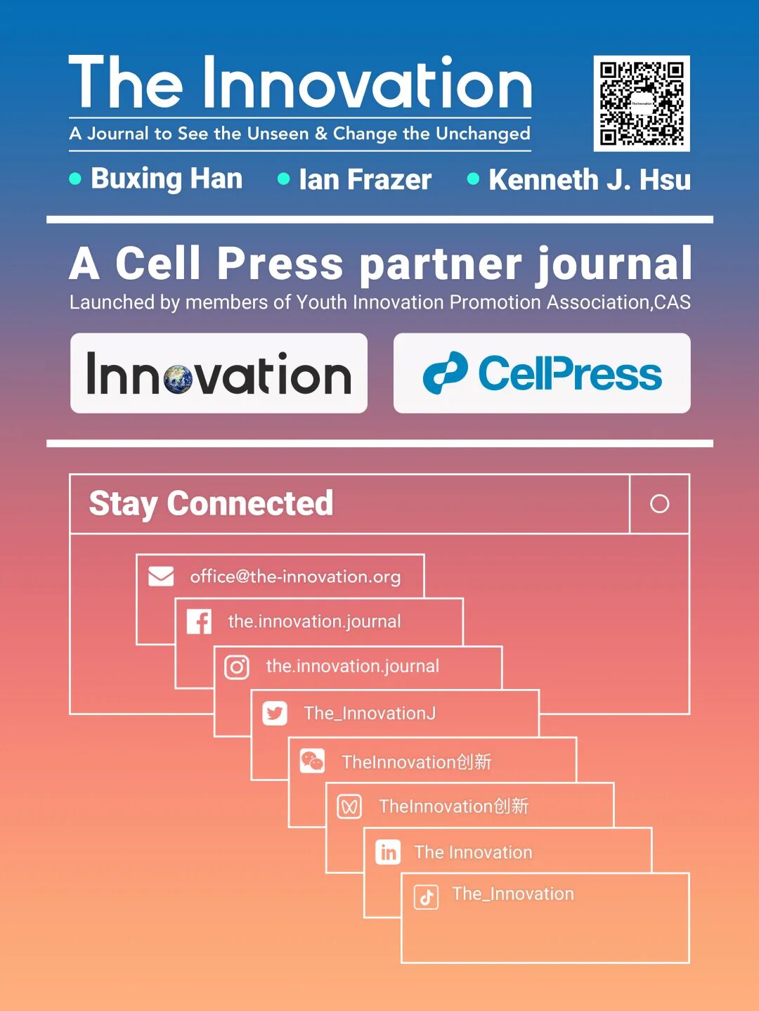 The Innovation是一本由青年科学家与Cell Press于2020年共同创办的综合性英文学术期刊:向科学界展示鼓舞人心的跨学科发现,鼓励研究人员专注于科学的本质和自由探索的初心。作者来自全球50个国家;已被116个国家作者引用;每期1/4-1/3通讯作者来自海外。目前有195位编委会成员,来自21个国家;50%编委来自海外;包含1位诺贝尔奖获得者,33位各国院士;领域覆盖全部自然科学。The Innovation已被DOAJ,ADS,Scopus,PubMed,ESCI,INSPEC,EI等数据库收录。秉承“好文章,多宣传”理念,The Innovation在海内外各平台推广作者文章。