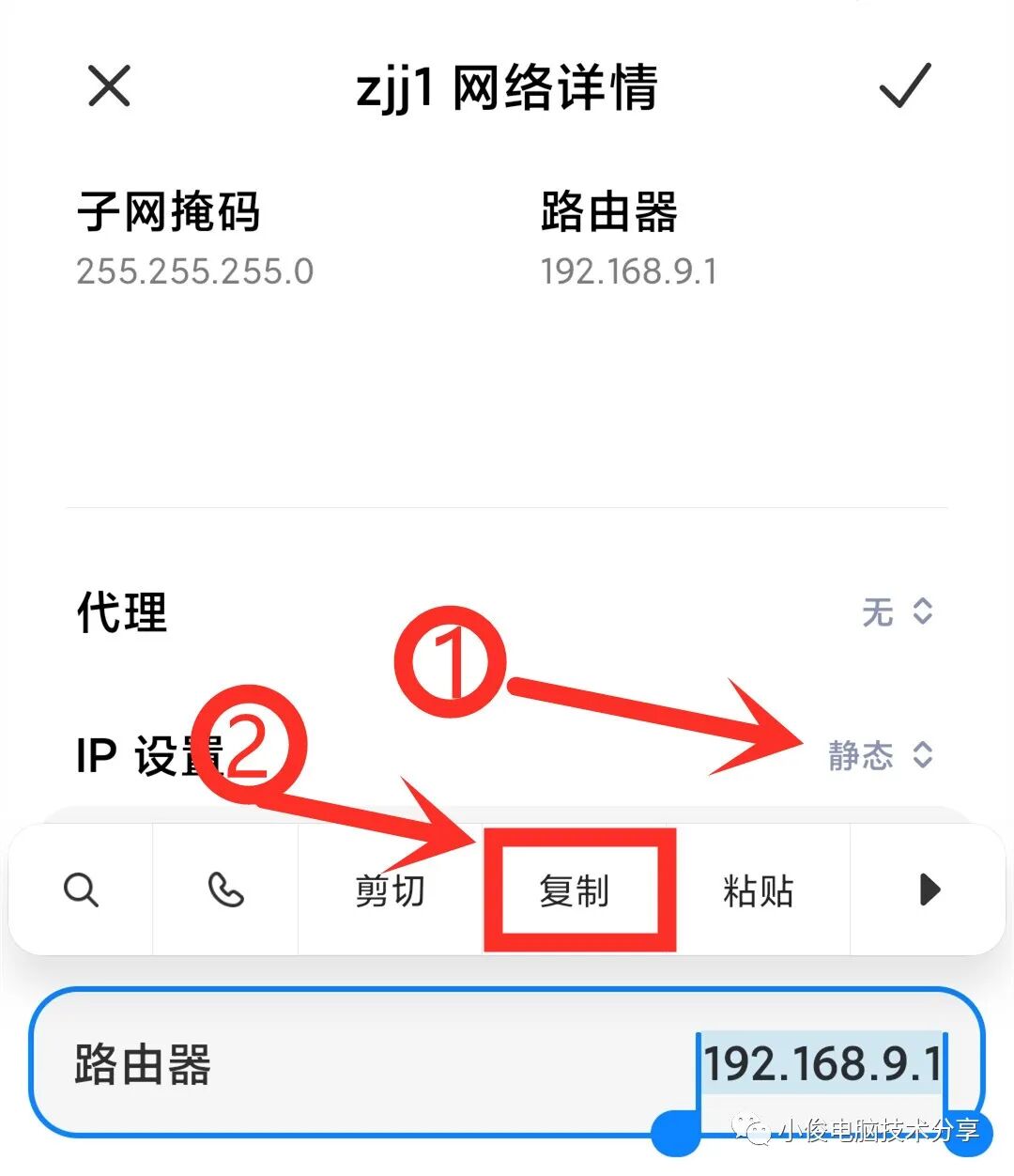 点击打开wifi设置界面之后,我们往上找到IP设置,然后把它点一下改为静态,接着我们就可以看到下面的路由器地址,此时我们长按这个路由器地址,选择复制