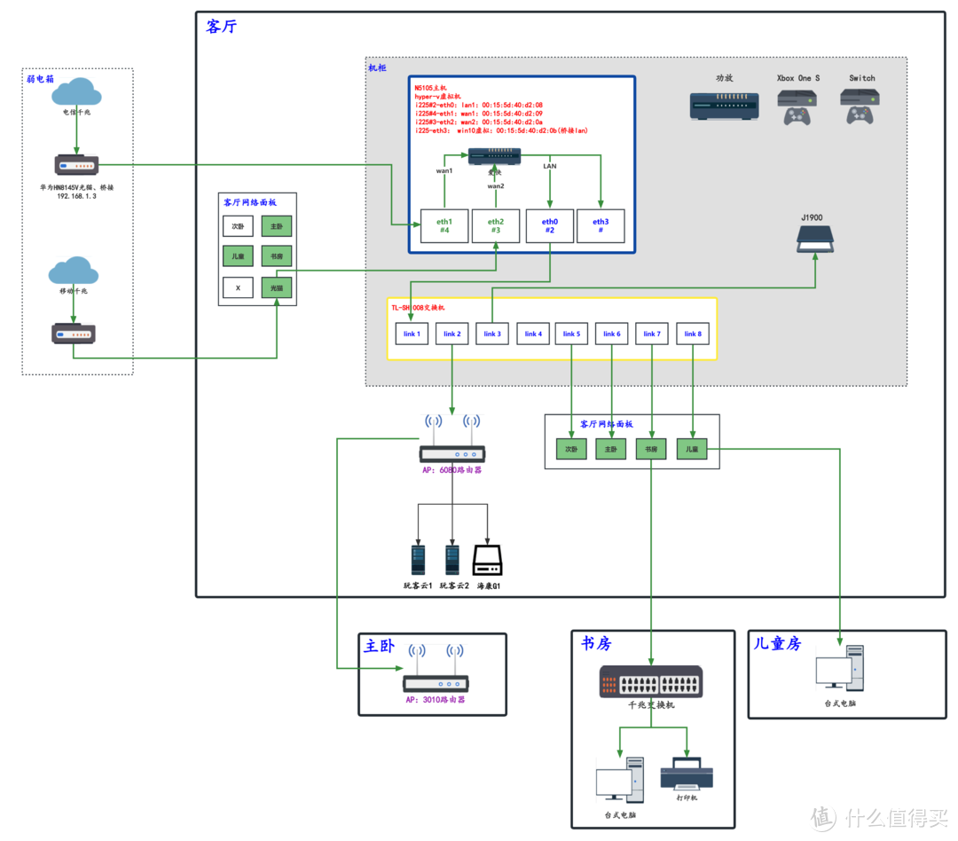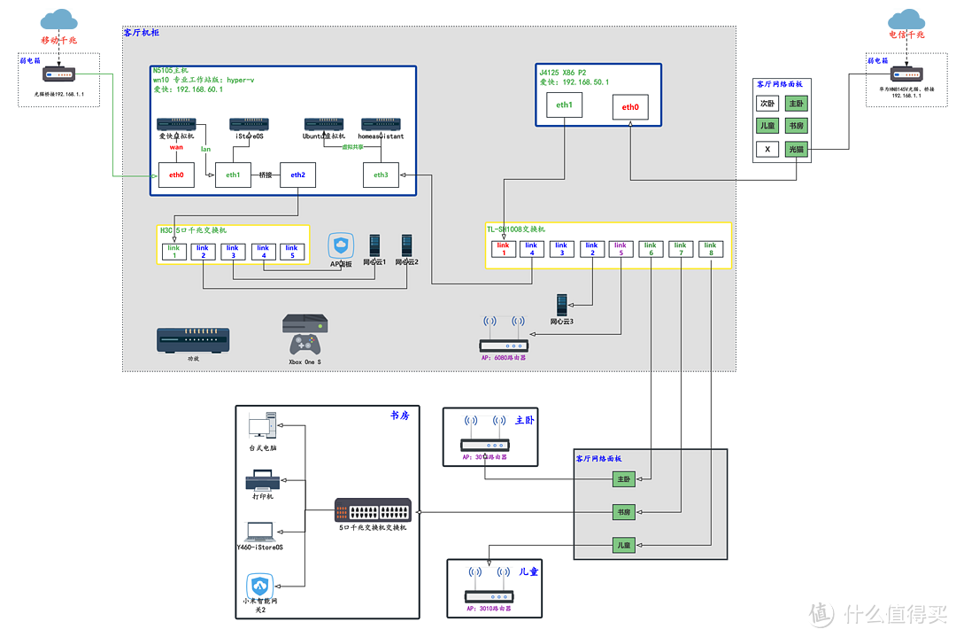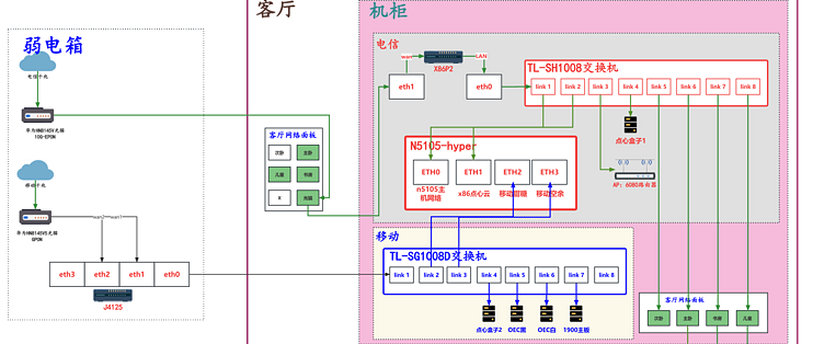 上面的方案,断断续续用了半年,还是总感觉少了点什么。而且这个时候,家里已经搞了7-8个网心云、2个甜糖、2个点心云了,各种设备全都一锅烩的放一条线上也不太稳妥,收益也不多。二期中间还试过几次,发现电信的竟然可以三拨叠加上行,移动的可以双拨叠加上行。于是就有了目前的网络拓扑了。