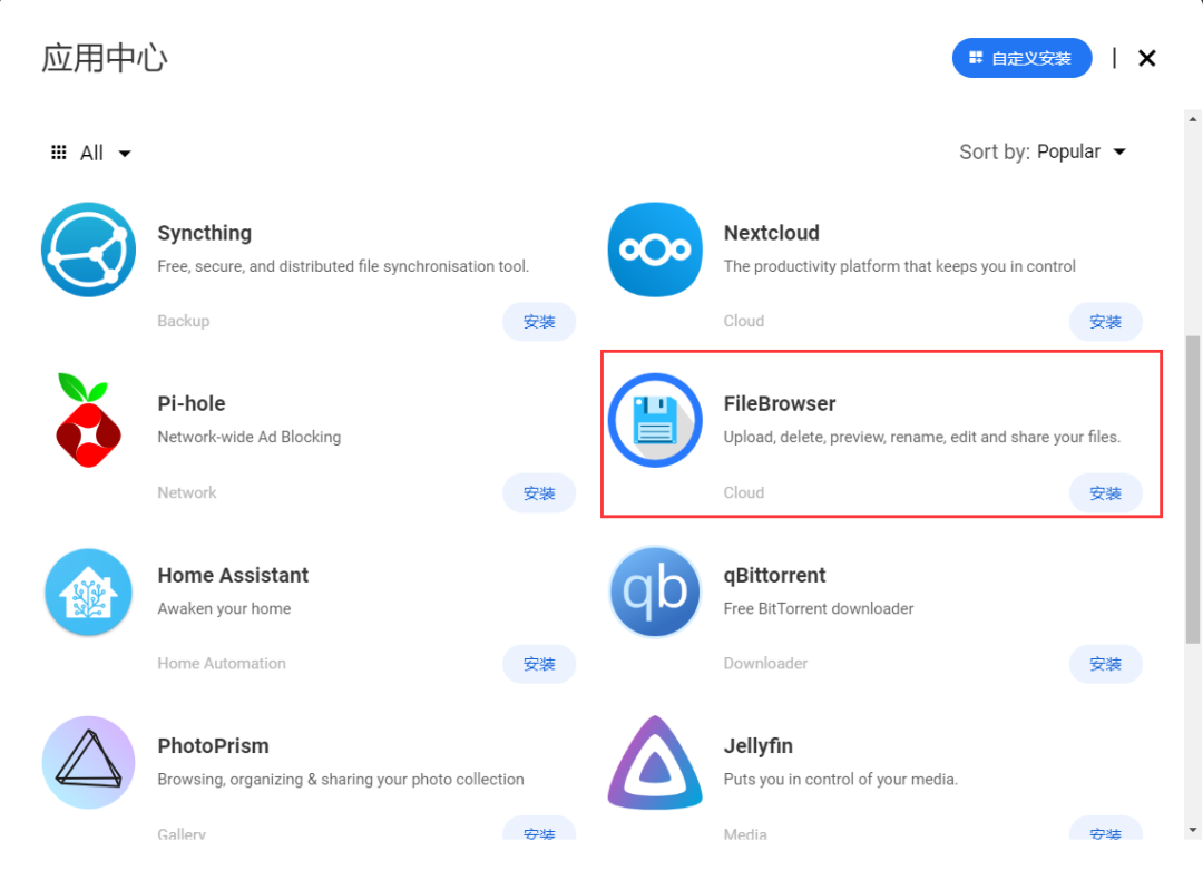 在应用中心里,我们可以找到一些比较实用的应用,比如我之前介绍过的 FileBrowser:
