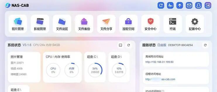 装好系统开机,nas软件选用的是NasCab,功能简单,基本满足了我的照片管理和影音管理需求,偶尔用一下文件浏览器,重要文件每天定时备份
