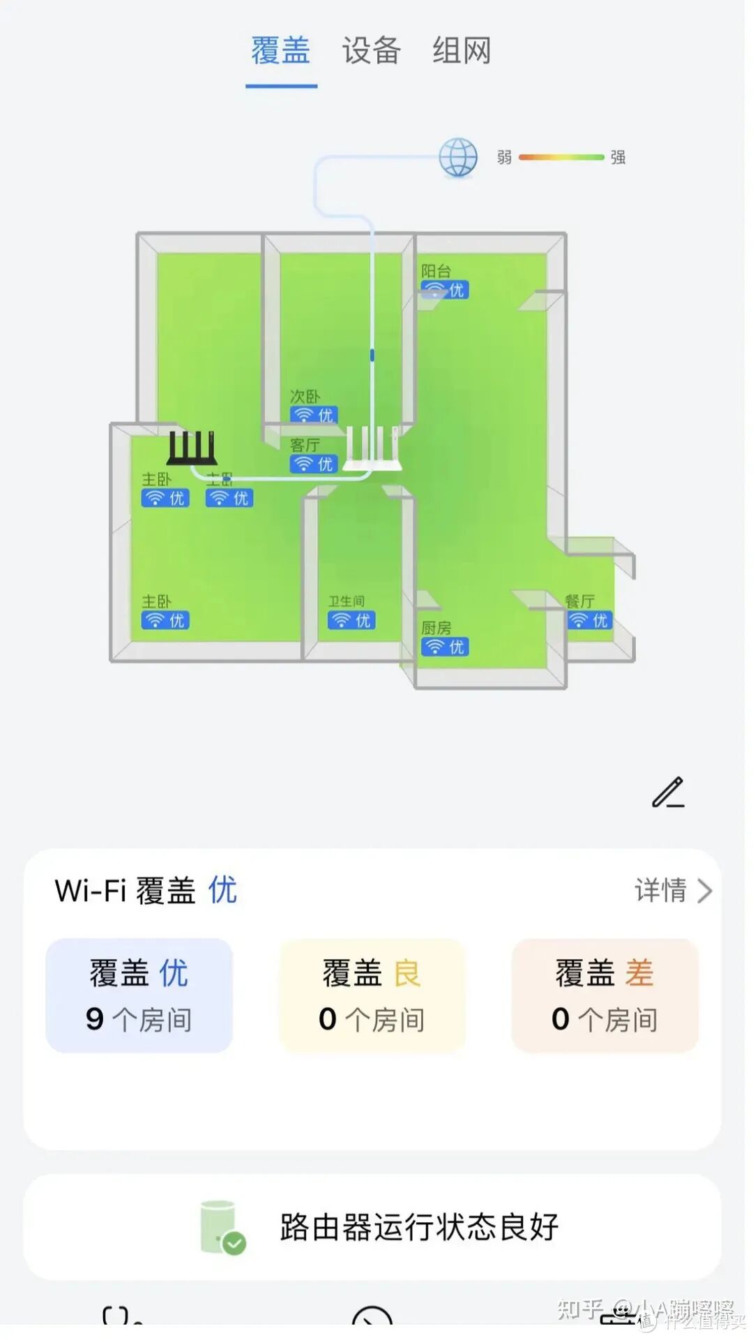 全屋覆盖 100分,无论是阳台,厨房,客餐厅,卧室,卫生间,整屋信号都很ok,从不同区域由主路由连接到从路由,无切换感。