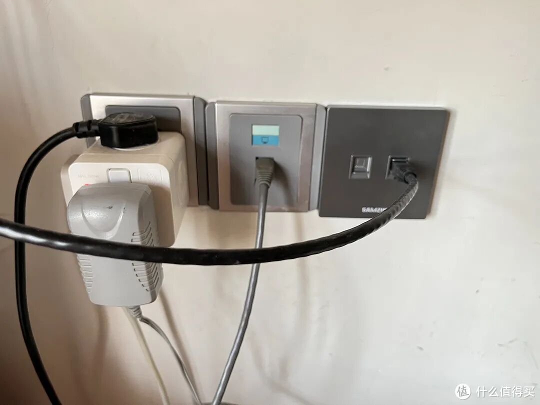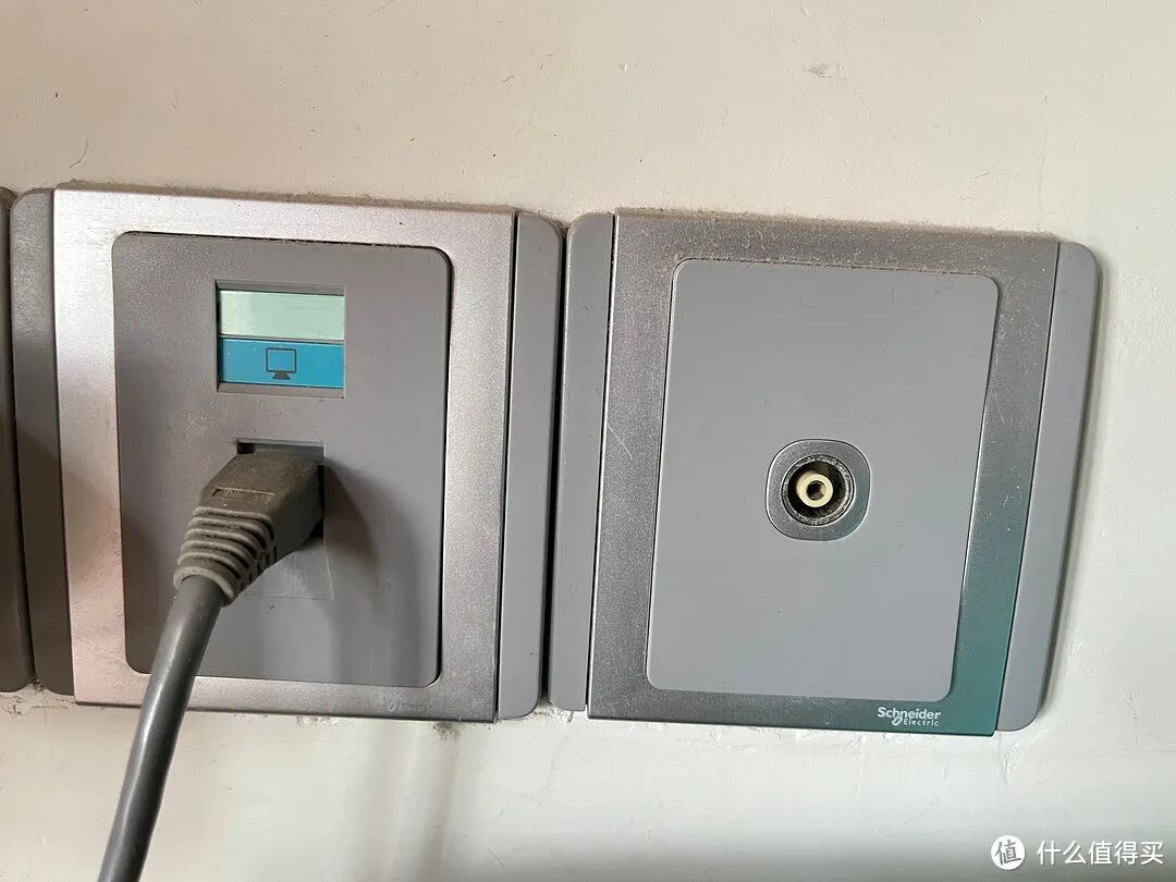 可惜施工过程我没拍到照片,提醒下大家在换线过程中,要特别注意绑线,我第一次就是接头那里没绑好,接头太大了,试了几次都进不去,只要加上光纤线怎么绑都进不去,最后还是忍痛把光纤拿掉了,所以光纤是白买了!之后我在抖音上看了一些专业人士的视频,发现还是绑法的问题,一般来说,一根4分管能放进2条网线+1条光纤线的。这是换好后的照片,只换了一根网线,所以双口6类网口面板也没用上。等下次吧,把老网线也接到新面板去,旧面板就改成5孔插座。