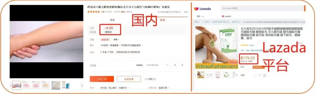 同样的商品在左侧国内的价格是8.8元,在右侧lazada平台是179泰铢=35.8元!