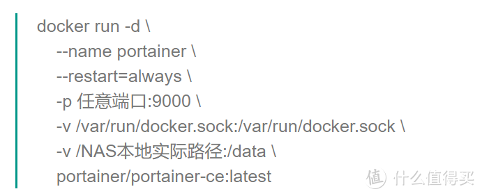 docker run -d --name=Portainer --restart=always -p 任意端口:9000/tcp -v /NAS本地实际路径:/data -v /var/run/docker.sock:/var/run/docker.sock portainer/portainer-ce:latest