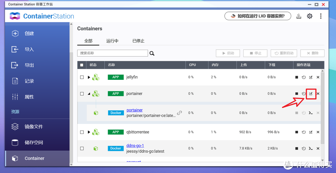 🔺对于威联通的Docker Compose而言,我们只需要点击已经部署好的Portainer后面的”编辑“按键。