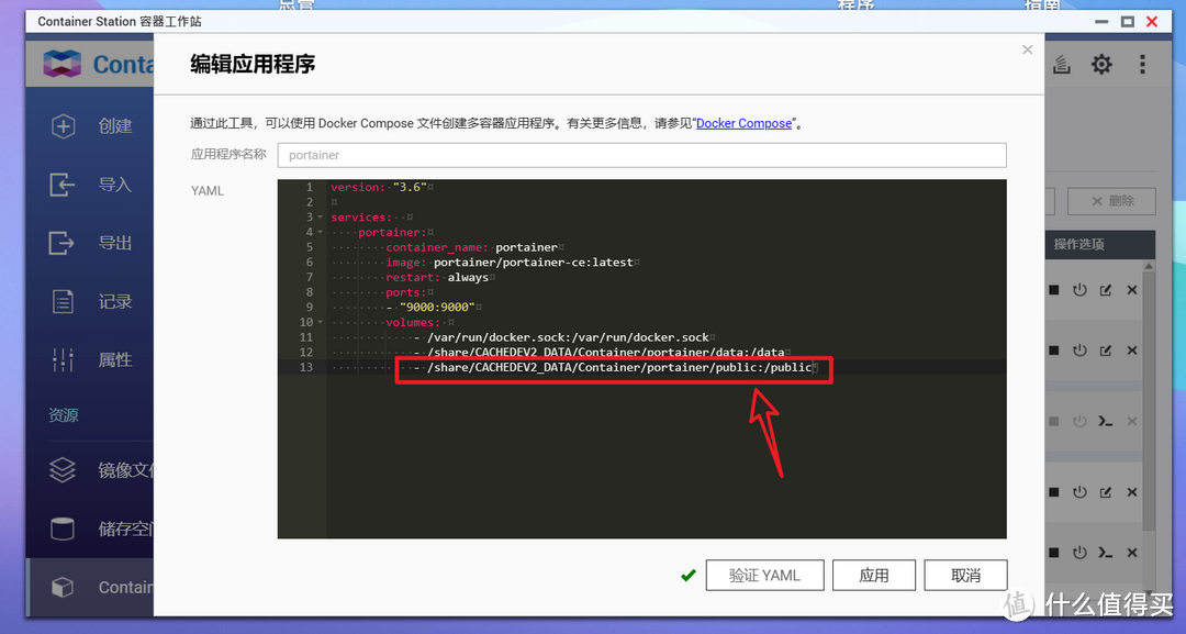 🔺然后在它之前的yml代码后面添加一个public文件映射(冒号前面映射到NAS中的public文件夹真实路径),然后重新安装一遍即可。