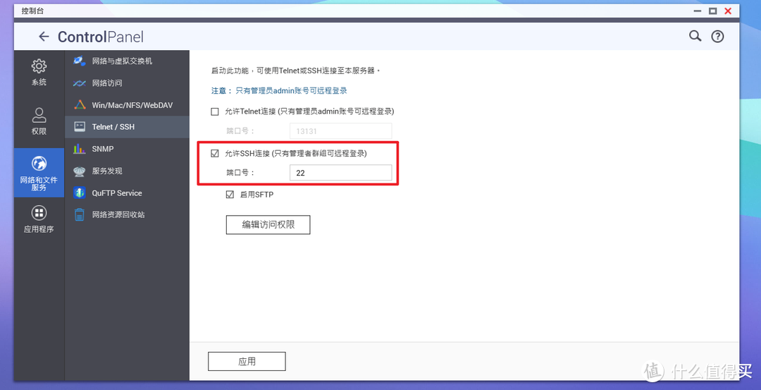 🔺然后开启NAS的SSH连接。威联通的在『控制台→网络和文件服务→Telnet/SSH』,勾选“允许SSH连接”即可。