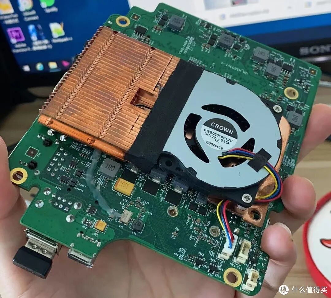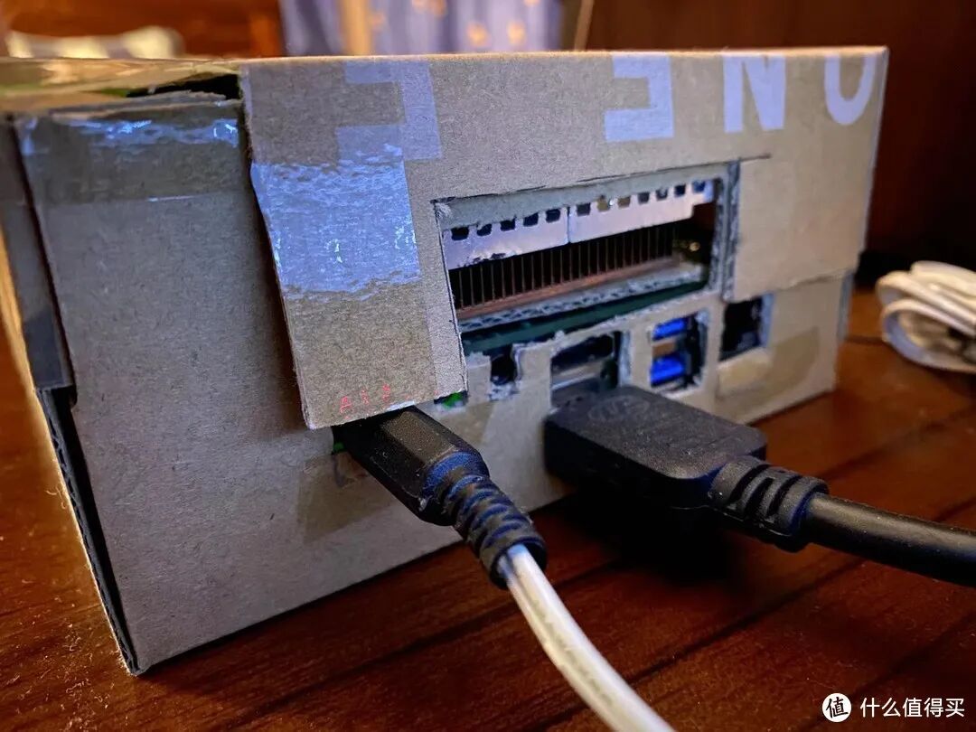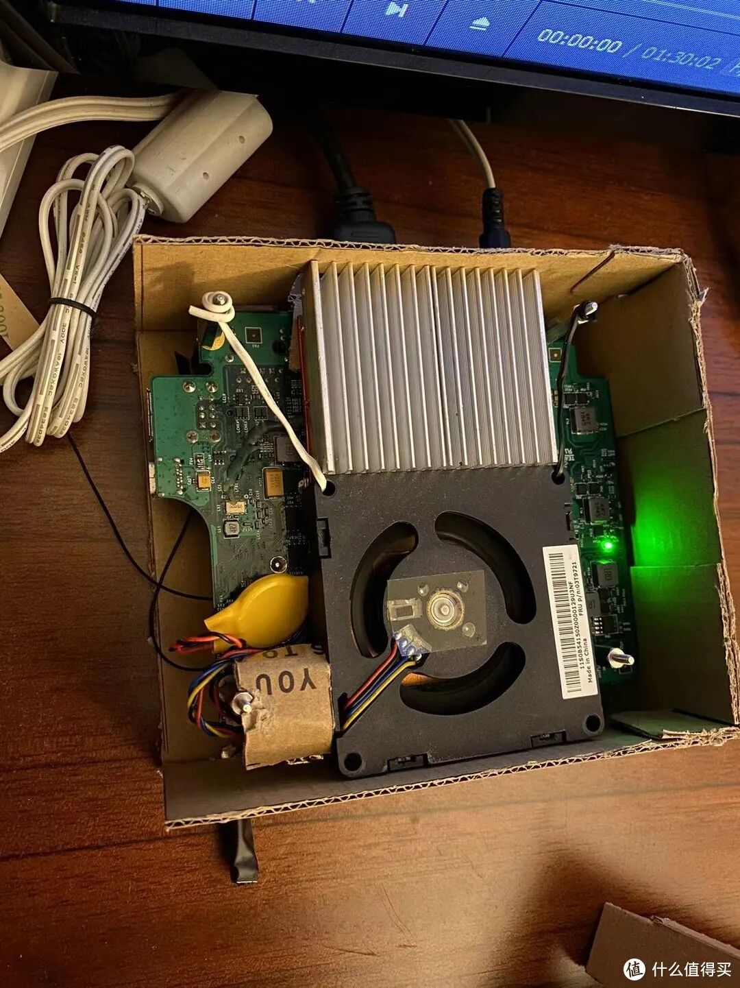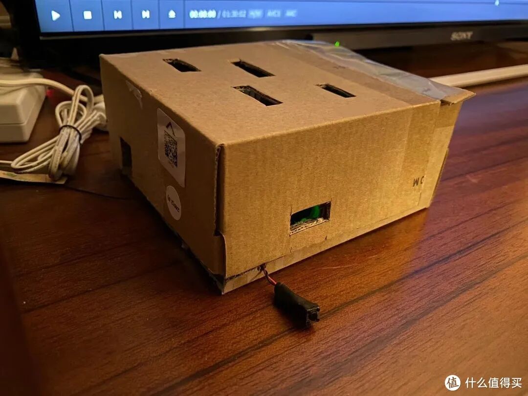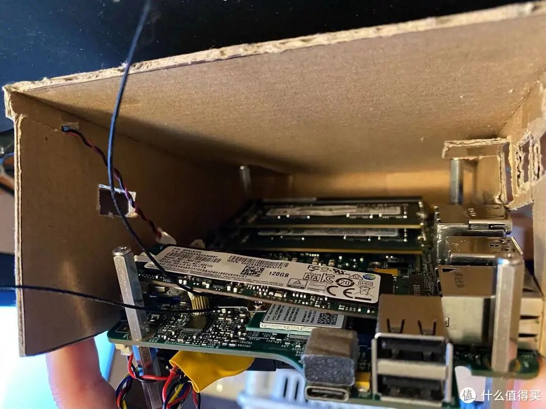 确定使用场景之后,我用长鞋盒切了个简易外壳,用之前M92p剩下的风扇替换了自带的散热风扇,简易加强了散热,用六角螺柱撑起主板,基本上也就做到了能用的水平,安静好用。