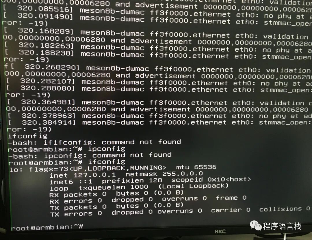 在Armbian系统设置过程中,会不时弹出无法绑定物理网卡信息,如下图。输入ifconfig命令查看系统的IP地址,这时显示inlet IP是127.0.0.1,明显不对。![]()