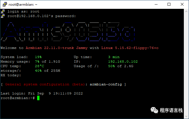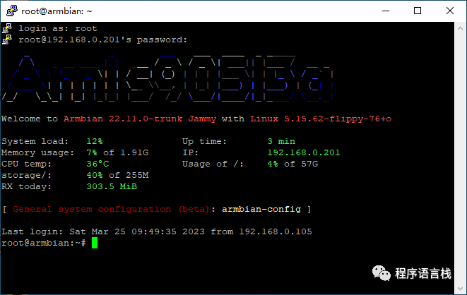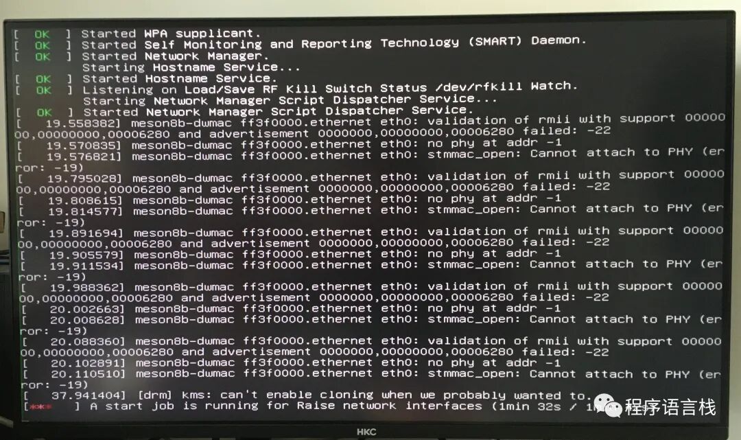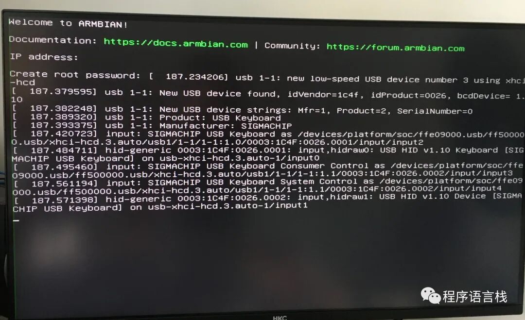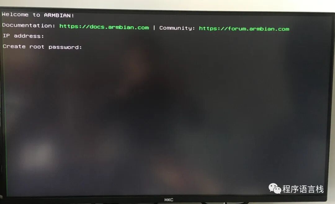 按电源键开机、电视盒子如果没有运行过Armbian,需要连续按遥控器方向右键,使系统从U盘引导启动。大概30秒后,插上HDMI线,观察屏幕显示。如果屏幕显示如下图,表明已经成功启动U盘中的Armbian系统了;如果进入的是电视盒子的安卓系统,就要关机,重新启动。![]()