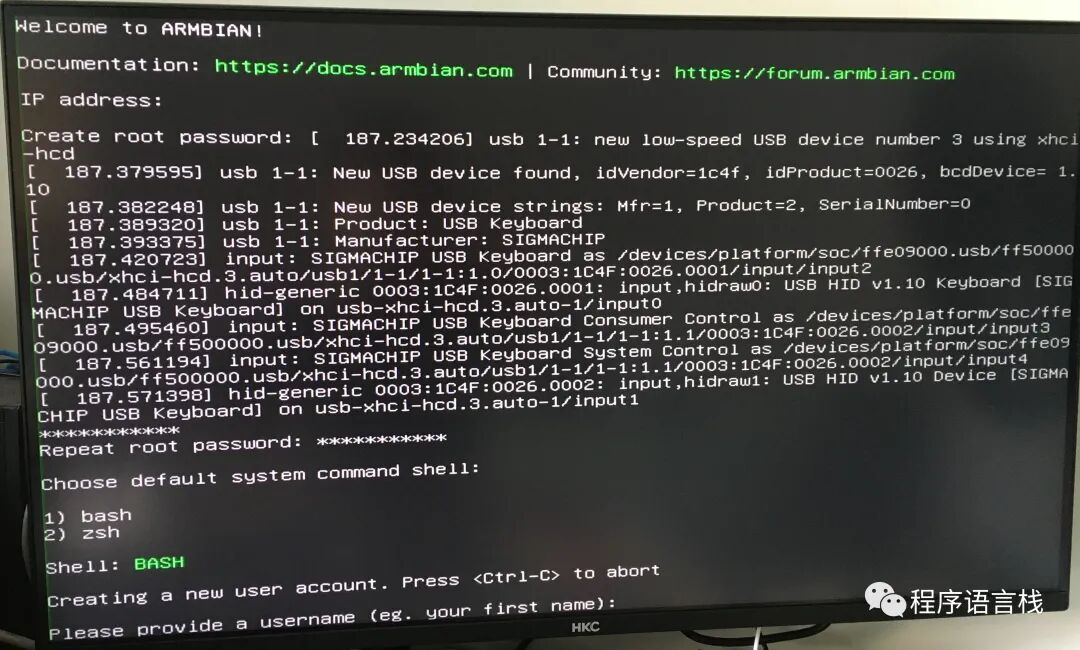 输入密码,需要输入两遍。随后会提示使用什么样的shell,选择1,使用BASH。选择完后会提示创建一个新的user account,暂时不需要,直接按Ctrl+C跳过。至此,Armbian系统基本设置也已完成,可以在shell中输入熟悉的linux命令了。![]()